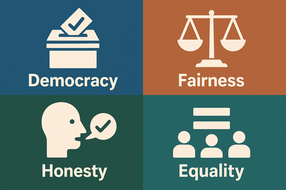 Fairness ensures equitable processes in hiring and discipline. Honesty demands clear communication, while equality drives diversity initiatives. Democracy involves employee input in decisions. Together, they support ethical cultures that enhance wellbeing and organisational integrity.